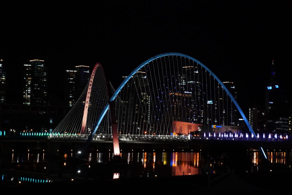 Am Freitag sind wir noch gut in Daejeon angekommen. Da wir ein bisschen zu früh waren und meine Bekannte noch eine Univorlesung hatte, haben wir uns zuerst ein Cafe gesucht. Dort hat dann jeder von uns noch sein Uni Business erledigt, bevor es dann zum Hostel ging. Im Hostel haben wir dann erstmal eingecheckt und uns eingerichtet. Anschließend ging es zuerst zu einer der Hauptfußgängerstraßen. Dort haben wir uns ein bisschen umgeschaut und noch eine Arcade gefunden. Das ausgesuchte Spiel war ein Tanzspiel, sowas wie Just Dance. In Korea gibt es dafür dann einen riesigen Fernseher, laute Lautsprecher und ein Bodenpanel mit Tasten auf die man dann hüpfen muss, je nachdem was der Bildschirm gerade anzeigt. Die erste Runde wollten wir eigentlich zu zweit im Duell bestreiten, aber das Spiel ließ uns nicht. So wurde die erste Tanzrunde von jedem alleine bestritten. Im zweiten Versuch klappte es dann und wir konnten gegeneinander antreten. Ich hab durch die Bank weg verloren, sah aber beim Zuschauen bestimmt lustig aus. Anschließend ging es noch ein bisschen weiter durch die Straßen und durch Zufall haben wir unser nächstes Ziel erreicht und zwar eine Bäckerei. Ihr fragt euch jetzt vielleicht, wirklich eine Bäckerei? Aber ja, eine Bäckerei. Und nicht nur irgendeine, sondern die wahrscheinlich beste in Korea. Dort gab es neben den üblichen Verdächtigen auch normales Brot. Vollkornbrot, Chiabatta und viele weitere leckere Sachen, die man sonst nur schwierig findet. Das besondere an dieser Bäckerei ist auch, dass es sie nur in Daejeon hat. Somit nehmen manche Leute auch in der Bäckerei etwas mit nach Hause, als Souvenier. Nach der Bäckerei ging es dann weiter über einen oder sogar mehrere Märkte. Die waren alle nicht so ganz auseinander zu halten, da sie mehr oder weniger in einander über gingen. Dort gab es dann von Früchten, Fisch, Fleisch, Reis, Kleidung, Haushaltsutensilien wieder einmal alles. Nach den Märkten ging es dann in die U-Bahn zu nächsten Station, den Fußbädern. Das ganze sind öffentlich zugängliche Füßbäder oder „Flüsse“, die sogar beheizt sind. Bevor man aber da einfach drin rum tapst, muss man sich erstmal die Füße waschen. Da es aber schon relativ dunkel war und wir nicht auch noch nasse Füße haben wollten, haben wir diese Sehenswürdigkeit nur besichtigt. Als nächstes wollte ich dann noch zu den Expo Brücken. Hierfür mussten wir leider ein wirklich sehr gutes Stück laufen. An den Brücken angekommen, habe ich noch ein paar Fotos gemacht und wir sind anschließend mit dem Bus zurück ins Hostel. Im Convenience Store noch ein Abendessen gekauft und dann war der Tag auch wieder vorbei. Hier noch die Bilder: