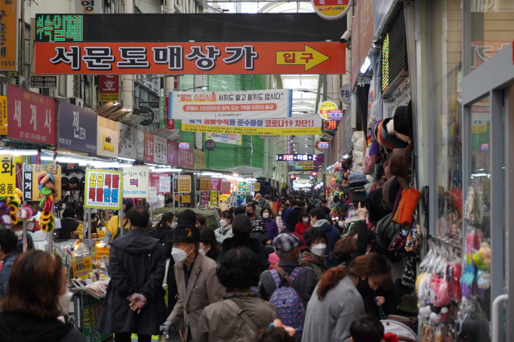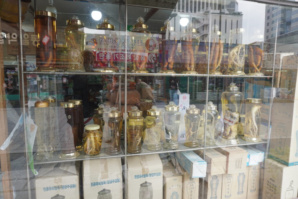 Am Samstag ging es dann in der Früh weiter nach Daegu. Da wir dort auch wieder früh ankamen, haben wir unsere Sachen schon im Hostel deponiert und sind anschließend ein Teil der verschiedenen Marktstraßen abgelaufen. Die „Altstadt“ besteht nämlich eigentlich aus vielen verschiedenen brachenspezifischen Straßen. So gibt es eine Straße für Farben, eine für Textilien, eine für Maschinenteile usw… Da Daegu aber auch bekannt für seine Medizinhistorie ist, gibt es natürlich auch eine Medizinstraße. Diese sind wir dann entlang gelaufen und man konnte alles mögliche an Kräutern oder Wurzeln in verschiedenen Läden kaufen. Anschließend sind wir noch durch einen kleinen, älteren Teil gelaufen, der noch sehr traditionell belassen war. Dort haben mein Bruder und ich auch damals einen Hanok Stay gemacht (Hanok ist die Bezeichnung für den traditionellen Hausbaustil). Durch das Viertel hindurch ging es danach zum größten Markt in Daegu. Dort sind wir auch wieder die ganzen Straßen hoch und runter gelaufen und diesesmal sogar mit relativ vielen Menschen zwischendrin. Auf dem Markt, hat man wie in Daejeon, fast alles gefunden. Lebensmittel gegenüber von Textilien oder Stoffen. Auf der anderen Seite dann Essenstände und frisches Obst und Gemüse. Nach zwei Runden durch das Gewusel sind wir wieder zurück in das Hanok Viertel und haben uns in einem der Cafes noch niedergelassen. Mit Tee und Limonade wurde dann die Zeit bis zum Einchecken ins Hostel überbrückt. Nachdem im Hostel dann wieder alles eingerichtet und verstaut war, ging es noch zu einem Thailänder, den wir als Empfehlung von Bekannten bekommen hatten. Leider stellte sich heraus, dass es diesen nicht mehr gab. So haben wir kurzerhand eine Alternative gesucht und auch gefunden. Wir mussten leider ein bisschen warten, aber das hatte sich am Ende gelohnt, da das Essen wirklich lecker war. Anschließend sind wir noch in eine Bar, um ein bisschen Halloween zu feiern, wobei die Bar, in der wir landeten, zum Glück nicht von Partywütigen Halloween Gästen überrannt wurde. Die Bar bot eine wirklich große Karte an Cocktails und so haben wir diverse probiert. Um Mitternacht war dann Schluss und es ging wieder Heim. Diesesmal aber in einer noch größeren Menschenmasse als zuvor, da jeder Laden nun zu gemacht hatte und alle Gäste auf die Straße strömten. Dort konnte man dann eine wirklich bunte Vielfalt an Kostümen bestaunen.