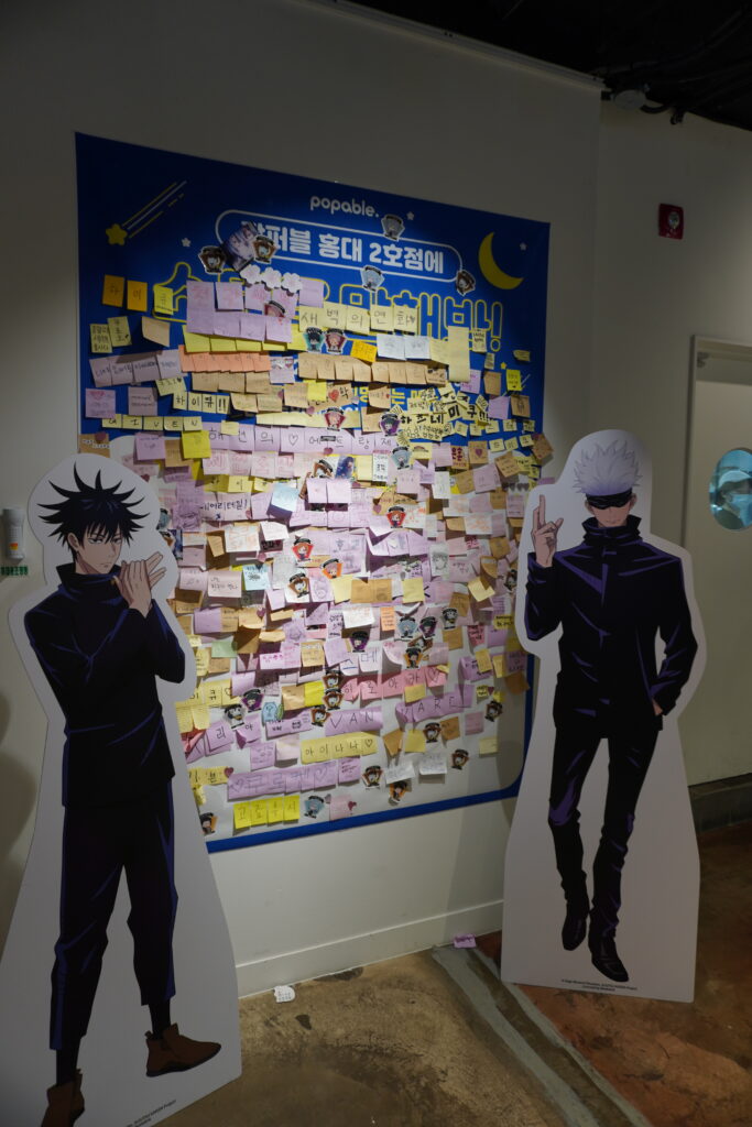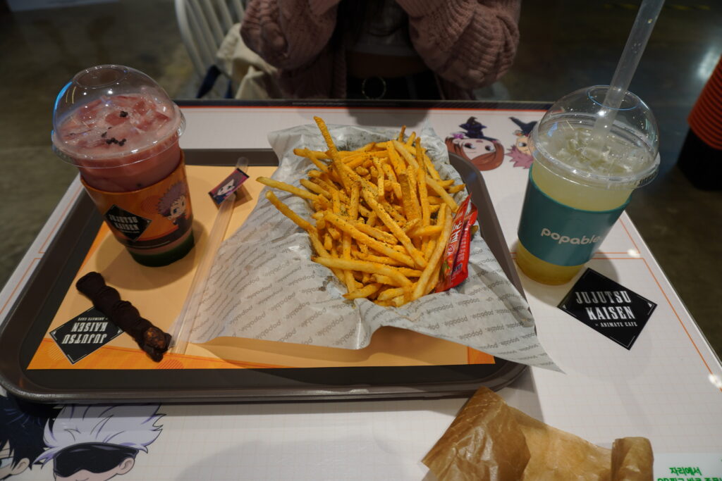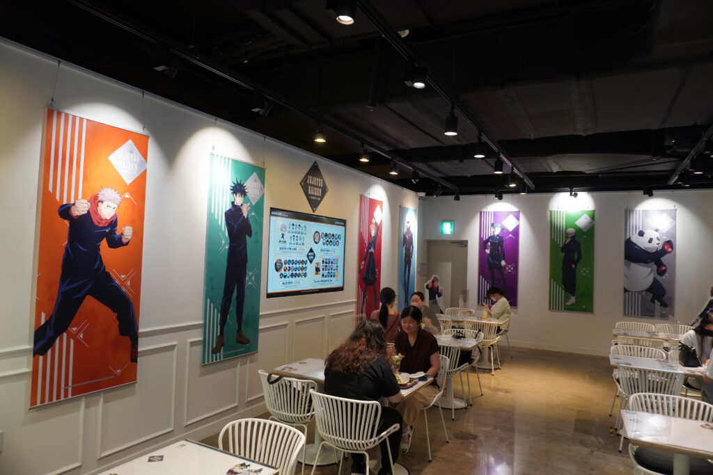 Nachdem das Unizeug erledigt war, ging es heute noch in ein Anime Themed Popup Cafe. Das Cafe war designed nach dem Anime Jujutsu Kaisen und wie der Name Popup andeutet zeitlich begrenzt. Da das nur noch heute und morgen ist, wollte ich unbedingt noch hin, auch wenn ich den Anime noch nicht gesehen habe. Das Cafe war eigentlich ganz schick eingerichtet mit Aufstellern und Postern der Hauptfiguren, genauso wie möglichem zufälligem Merch, den man beim Kauf von Getränken und Speißen erwerben konnte. Da ich ihn nicht gesehen habe, blieb ich aber bei Getränken ^^. Von der Uni hatte ich noch ein paar Leute getroffen, die auch dorthin wollten, und somit war ich nicht alleine dort. Hier ein paar Bilder, wie es dort aussieht: