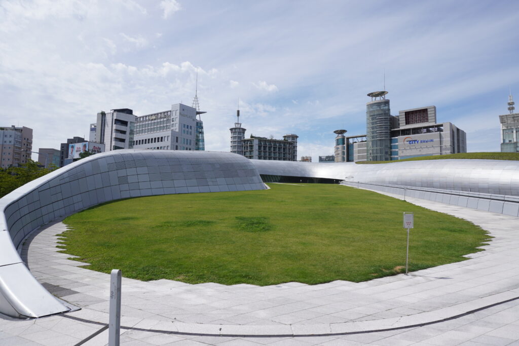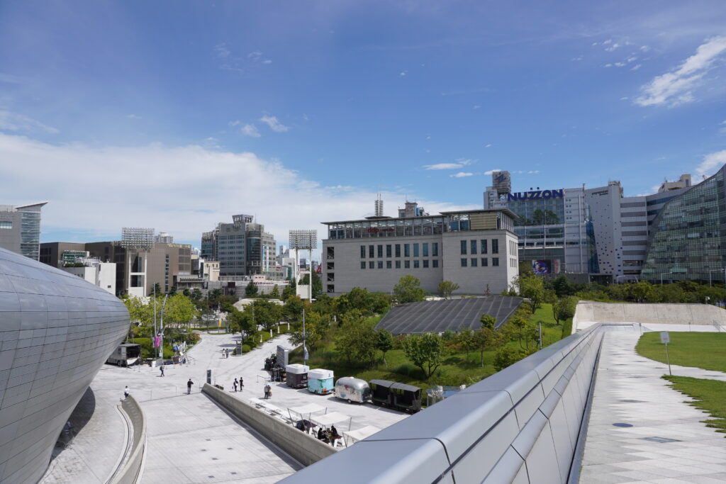 Gestern (Sonntag) war ich dann wieder mit meiner Bekannten unterwegs. Diesesmal haben wir uns den Dongdaemun Design Plaza (DDP) angeschaut. Das ist so ein ganz spaciges Gebäude, das von Zaha Hadid entworfen wurde und dort ein altes Stadium ersetzt hat. Das bemerkenswerte ist, das Gebäude besitzt keine Ecken, sondern nur Rundungen. Da das ganze als „Design“ Plaza definiert ist, befinden sich im Inneren auch verschiedene Mussen und Ausstellungen rund um das Thema Design. Also einfach frei der Nase nach, einmal drum herum gelaufen und rein geschaut. Dort waren ein paar wirklich interessante Sachen zu entdecken, wie eine Videoinstallation und diverse neue Konzepte zu möglichen neuem Wohnen. Nach dem DDP ging es noch in ein paar der angrenzenden Fashion and Shopping Malls. Diese waren innendrin aber erheblich zusammen geschrumpft, sodass von fünf oder mehr Stockwerken nur die Untersten belegt und belebt waren. Da es dort dann doch nicht allzu viel zu sehen gab, sind wir weiter Richtung City-Fluss (nicht der Han). Auf dem Weg dahin, hab ich mir noch ein lokales Streetfood Mittagessen geholt, was aus einem Käsekern bestand, der in erst in Teig und anschließend in Pommes gedipt wurde. Das ganze war etwas unhandlich zu essen, aber eigentlich ganz lecker. Am City-Fluss sind wir dann flussaufwärts gelaufen mit der groben Richtung Rathaus. Der City-Fluss ist eingentlich kein richtiger Fluss, sondern dient auch bei starkem Regen als Abfluss für das ganze Regenwasser. Deshalb sind die beiden Wege am Fluss nur bei schönem Wetter freigegeben und können bei Bedarf gesperrt werden. Da meine Bekannte noch einen guten Tipp für ein traditionelles Teehaus bekommen hatte, sind wir nach ein bisschen erstmal vom Fluss weg und in eine kleine Shopping Straße gelaufen. In der Shopping Straße selber, gabe es alles von Kalligrafiepinsel, über Fächer bis Kunst aus Zucker. Das Teehaus lag aber etwas versteckt in einer Seitengasse, sodass wir das erst suchen mussten. Da wir aber ein Bild hatten, war es zügig gefunden. Im Teehaus selber haben wir uns dann einen Marigoldtee, einen Rose Ice Tea und ein paar Mochis bestellt (Mochis sind eigentlich traditionelle japanische Reiskuchen mit Rotebohnen Füllung). Dort saßen wir dann eigentlich relativ lange und gemütlich, bevor wir dann wieder weiter zum Fluss zurück sind. Am Fluss angekommen sind wir noch die restlichen paar Meter bis zur „Quelle“ gelaufen. Von der Quelle aus ging es dann weiter bis zum Rathaus, wo noch ein paar Fotos mit dem I SEOUL U Logo gemacht wurden. Danach ging noch zum Einkaufen für ein Abendessen, da wir kochen wollten. Nachdem die Gemüseauswahl hier etwas anders ist als bei uns, haben wir auch ein paar Sachen mitgenommen, von denen wir nicht wussten, ist es Zucchini oder nicht. Am Ende würde ich sagen, gehört es in die Familie, aber es war keine Zucchini im eigentlichen Sinne, trotzdem lecker, also rein in die Pfanne. Gekocht wurden Nudeln mit Gemüse, das ganze dann mit Ei in einer Pfanne angebraten. Das Abendessen war wirklich lecker, aber so viel, dass ich jetzt für morgen noch ne Portion hab. Anschließend wurde noch ein bisschen gequatscht und dann auch wieder die Sachen gepackt, da heute ja wieder Uni war. Hier noch die Bilder vom Tag: