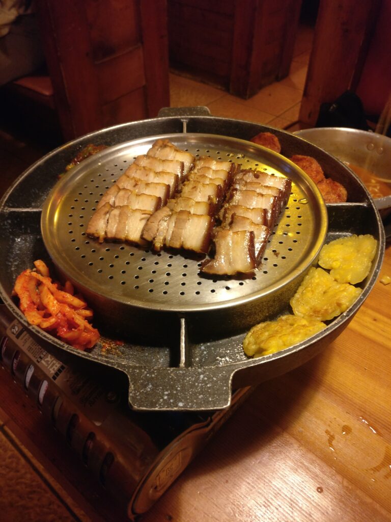 Gestern (Samstag) hatten wir uns wieder verabredet, diesesmal zum Fahrradfahren am Han Fluss. Der Han Fluss ist hier der größte Fluss in Seoul und teilt die Stadt in Nord und Süd. Am Han selber kann man an vielen verschiedenen Stellen Fahrräder ausleihen, manchmal mit Bezahlung manchmal sogar ohne. Da wir aber direkt aus unserer Ecke starten wollten, viel die Wahl auf die Fährräder der Stadt Seoul. Das ganze ist ähnlich wie in München ein Mietsystem, mit dem man einfach mit einer App ein Fahrrad ausleihen kann. Für die Stadtfahrräder musste man zuvor noch einen Pass kaufen. Dieser umfasst entweder 1h, 2h oder einen ganzen Tag, um Fahrrad zu fahren. Nach anfänglichen Startschwierigkeiten, die Räder zu entsperren, klappte es anschließend doch und wir machten uns auf den Weg. Hier fängt der Spaß eigentlich erst an, denn es gibt kaum Fahrradwege. Das heißt, man muss entweder auf der Straße, nicht zu empfehlen, oder dem Gehweg, auch nicht zu empfehlen, fahren. Die Wahl viel kurzerhand auf den Gehweg, da man hier nicht so sehr von koreanischen Autofahren aufpassen muss. Dafür muss man jetzt halt vorsichtig durch diverse Menschenmengen manövrieren. Nachdem wir ein gutes Stück an der Hauptstraße geschafft hatten, ging es durch ein paar Nebenstraßen zum Han. Am Han selber wurde das Fahrrad fahren dann deutlich besser, da es hier nun einen eigenen Radweg hatte. Dieser war aber auch gut benutzt von allerhand anderen Fahrradfahrern, sodass es etwas entspannter war, aber man noch nicht komplett sorglos fahren konnte. Nach einem guten Stück ging es dann vom Han wieder weg, um erstens die Fahrräder wieder zurück zu geben und zweitens um etwas zu Mittag zu essen. Die Fahrräder lassen sich leider nur eine Stunde am Stück ausleihen, bevor man sie zurück geben muss. Einmal zurück gegeben kann man sie aber gleich wieder ausleiehen. Nachdem wir zu Fuß ein bisschen durch die Gegend gelaufen sind, haben wir unser Mittagessen gefunden. Diesesmal gabs Sandwich Toast mit verschiedenem Inhalt. Das wurde gleich vor Ort in der Nähe gegessen und anschließend ging es wieder mit den nächsten Rädern weiter zum Han. Nun überquerten wir den Han hin zur Südseite. Auf der anderen Seite ging es dann wieder dem Radweg am Fluss entlang. Nach ein bisschen Strecke haben wir dann einen schönen Ort gefunden, wo man sich hinsetzten konnte. Bevor wir uns hingesetzt haben, ging es noch einmal die Räder erneuern. Am Platz konnte man dann eine schöne Aussicht auf den Fluss und den N-Seoul Tower genießen. Nach einer längeren Pause ging es die Räder nochmal erneuern und dann wieder zurück Richtung Heimat. Nach einem guten Stück am Fluss entlang wurden die Räder noch ein letztes Mal getauscht, bevor es dann über eine der Brücken wieder zurück auf die Nordseite ging. Einmal noch durch die Menschenmassen geschlichen waren wir wieder da. Als Belohnung gabs noch eine Bubble Waffel. Eine Waffel mit gefüllten Kugeln. Sehr lecker, aber nicht ganz so weich wie eine normale Waffel. Nach der Stärkung gings dann für jeden wieder Heim. Fürs Abendessen hatte ich noch eine andere Gruppe gefragt, ob jemand Lust hätte. Aus der Gruppe hatte nur eine Person Zeit, aber so traf man sich später noch fürs Abendessen. Zum Abendessen gab es Bossam (보쌈). Bossam ist in unserem Fall gekochter bzw gegarter Schweinebauch mit vielen Beilagen gewesen. Das ist eine etwas andere zubereitung als beim Korean BBQ. Es gab wirklich viel zu Essen, sodass wir beide sehr satt wurden. Anschließend ging es noch eine Runde durchs Viertel spazieren mit Ziel der Unterkünfte der Uni. Dort haben wir uns verabschiedet und ich bin wieder nach Hause. Bilder hier: