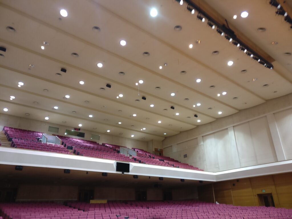 Heute (Montag) war dann wieder alles auf einmal. Am Vormittag gab es zuerst eine Vorlesung mit Vorbereitung für die Klausur am Donnerstag. Im Anschluss gleich die nächste aufgezeichnete Vorlesung. Dann einen Bissen essen und sich für die Prüfung fertig machen. Die Prüfung war eigentlich einfach bis okay (ich bin gespannt, obs dann auch tatsächlich so war) und relativ schnell vorbei. Nach Abschluss sollten wir dem Professor unsere Lösungen per Mail schicken und er würde antworten, ob er alles bekommen hat. Erstmal habe ich keine Antwort bekommen, was mich aber dann nicht weiter kümmerte, da ich schon zum nächsten Termin musste. Heute war nämlich auch noch die Abgabe der Fingerabdrücke für meine Alien Registration Card, also meinen Aufenthaltstitel. Leider schnitt sich der Termin genau mit meiner nächsten Vorlesung, also bin ich so schnell es ging rüber auf den Campus, musste dort aber ersteinmal gefühlt 100 andere Dinge ausfüllen und unterschreiben, bevor ich dann eine Wartenummer bekam, danke… Nach ein bisschen warten war ich dann aber zum Glück relativ schnell dran und konnte mich auf den Weg nach Hause machen. Das einzig naja Gute an der Sache war, bei meinem Prof hat das Zoom ne halbe Stunde nicht funktioniert. Und mehr oder weniger, als ich genau nach Hause kam, gings dann wieder, also hab ich die Vorlesung noch komplett mitbekommen und die Fingerabdrücke auch erledigt. Hier noch ein Bild aus dem Auditorium der Uni: