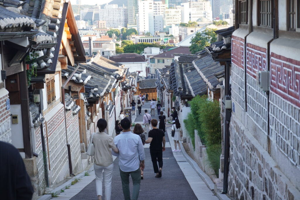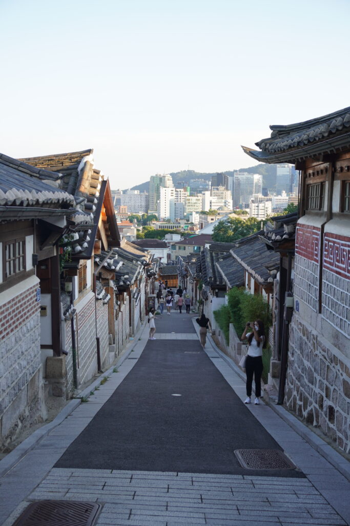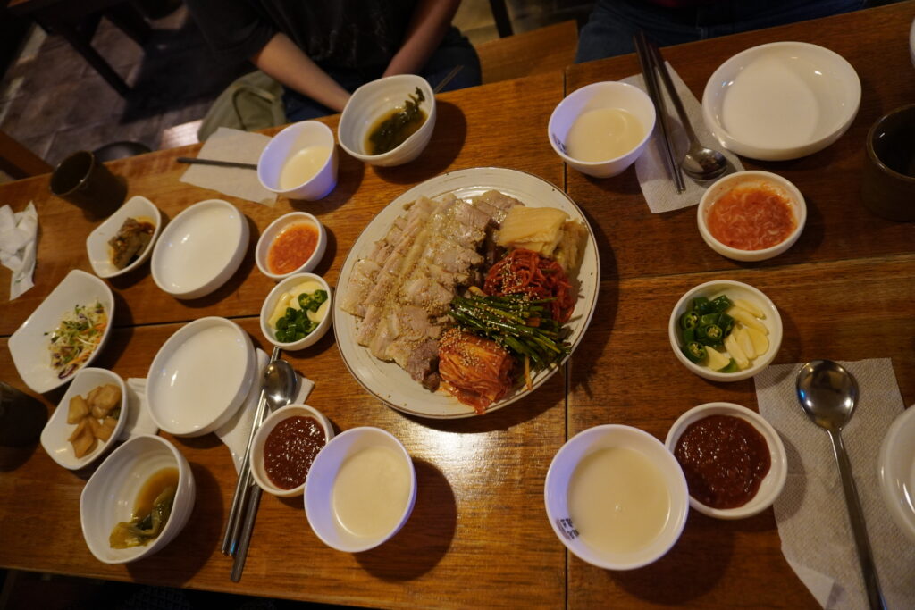 Heute (Sonntag) war ich mit den Leuten von der ersten Wanderung unterwegs. Ursprünglich war geplant in ein Soju Museum zu fahren und ein Soju Tasting zu machen. Leider war das aber nicht geöffnet. So sind wir also nach Insa-dong (einem Stadtteil), um uns ein bisschen die dortige Marktstraße anzuschauen. In der Marktstraße selber gibt es von Restaurants, traditionellen Teehäusern, Geschäften für Kalligraphiepinsel und Geschäften für Souveniers einfach alles. (Das traditionelle Teehause, wo ich schon war, ist ebenfalls dort) Da wir erste gegen Mittag dort waren, haben wir uns noch in einer eher traditionellen Küche ein Mittagessen geholt. Bestellt wurden zwei Suppen mit Dumplings (gefüllte Teigtaschen, auch Mandu genannt) und einmal eine Variation an verschiedenen Dumplings. Insgesamt ein sehr sättigendes Essen und wirklich lecker! Anschließend sind wir noch zum Stadtfluss (Cheonggyecheon – 청계천) und haben dort ein bisschen die Füße für Abkühlung ins Wasser gehalten. Danach sind wir noch am größten Palast vorbei gelaufen (Gyeongbokgung – 경복궁) und ins Bukchon Hanok Village gegangen. Das Village besteht vor allem aus alten und traditionellen Häusern. Ein Großteil wurde vermutlich aufwändig renoviert und hergerichtet, sodass es nicht mehr wirklich „alt“ ist/aussieht, aber der Stil ist auf jeden Fall erhalten geblieben. Nach einer großen Runde und einigen Fotos haben wir uns wieder auf den Weg zurück gemacht, noch eine Freundin von den Leuten getroffen und sind dann gemeinsam zum Abendessen, mit Cafe im Anschluss. Das Essen, sowohl im Restaurant, als auch im Cafe waren wirklich lecker. Hier wieder die Bilder: