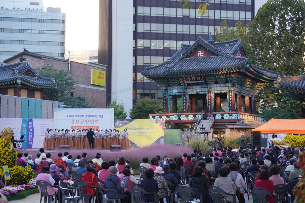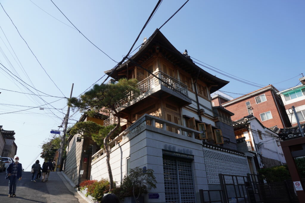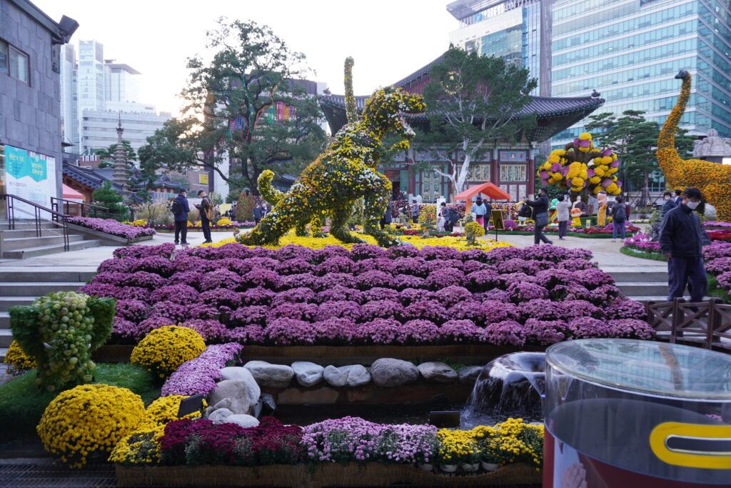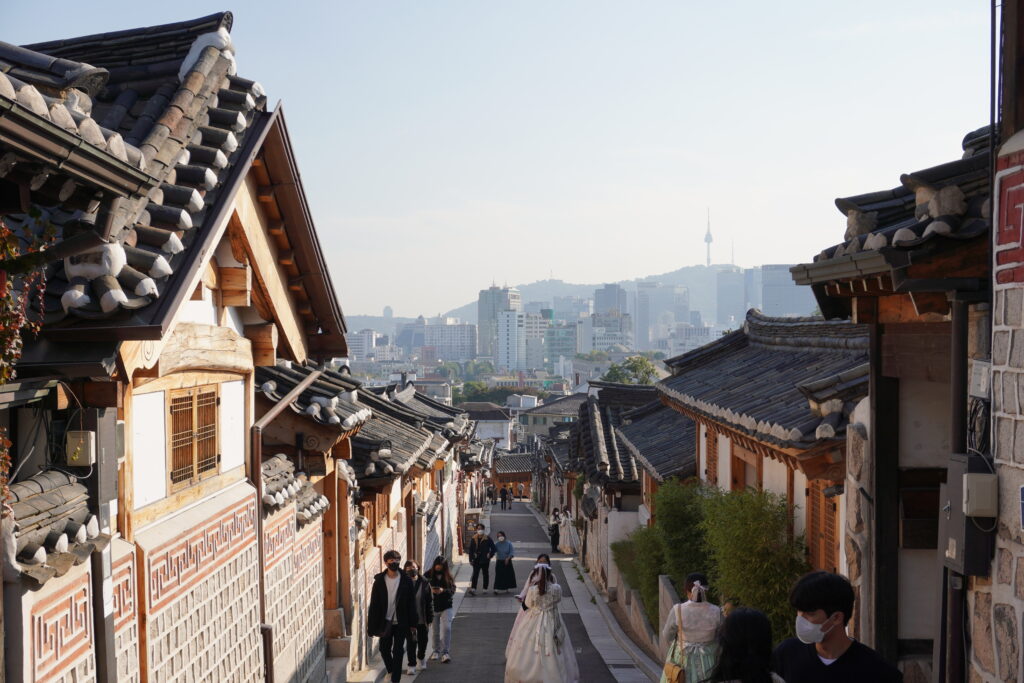Gestern (Samstag) ging es dann mit meiner Bekannten zum Bukchon Hanok Village. Da war ich schon mal, das war das mit den traditionellen Häusern. Außerdem trafen wir noch die Bekannte von gestern mit Freunden. So sind wir dann gemeinsam am Nachmittag noch durch das Village gelaufen. Zufälligerweise sind wir noch mit einem Fotograf ins Gespräch gekommen, der uns dann ein paar gute Plätze gezeigt und noch Fotos von uns gemacht hat. Nach einem längeren Plausch sind wir dann noch ein bisschen weiter gelaufen und haben einen Platz in einem der traditionellen Teehäuser noch ergattern können. Nach dem Tee sind wir dann noch zu einem Tempel in der Nähe, der uns auch vom Fotograf empfohlen wurde, da viele blumengeschmückte Figuren im Tempel standen. Und nicht nur die Figuren waren mit Blumen geschmückt sondern auch Teile des Tempels. Nach einigen Fotos haben wir uns noch die Predigt, wenn man das so nennt, angeschaut und ebenfalls den Chor, der zwischendrin noch einen Auftritt hatte, bewundert. Im Anschluss ging es zum Abendessen. Die Wahl viel auf einen sehr fancy Thailänder/Vietnamesen. Dort mussten wir leider etwas länger warten und hatten dann auch noch das Problem, dass wir zu fünft waren und die Betreiber mindestens eine in Korea geimpfe Person haben wollten. Ausländische Nachweise zählten nicht… Wir konnten dann zum Glück vereinbaren, dass wir uns getrennt an zwei Tische setzen. So haben wir uns fürs Abendessen kurz getrennt und sind danach wieder gemeinsam weiter. Das Ambiente war wirklich sehr schön mit Indoor Pool und ‚Wasserfall‘. Das Essen war natürlich ebenfalls sehr gut. Nach dem Essen haben wir uns dann wieder getroffen und sind gemeinsam weiter. Eigentlich war geplant in eine Bar zu gehen, da wir aber so lange warten mussten haben wir uns dagegen entschieden, da wir noch durch die halbe Stadt hätten fahren müssen und sind so ein bisschen durch die Gegend. An einem Straßenstand gab es dann wieder koranische Nachspeise zu kaufen und gleich nebenan haben wir sogar noch eine Bar gefunden, in der wir uns dann niedergelassen haben. Dort haben wir dann ein paar Spiele gespielt und uns einen schönen Abend gemacht. Um zehn ging es dann aber wieder weiter. Es ging erstmal wieder nach Hause, wo sich noch mit fehlenden Jacken eingedeckt wurde und anschließend sind wir noch zu einem Park hier in der Nähe. Nach ein bisschen rum sitzen wurde es aber zu kalt und wir haben uns wieder in Bewegung gesetzt. Nach einem kleinen Spaziergang ging es dann wieder Richtung Appartment der Freunde. Vorher noch mit einem Mitternachtssnack eingedeckt gab es dort noch zwei Folgen Squid Game nochmal und danach ging es auch wieder Heim. Hier noch ein paar Bilder: