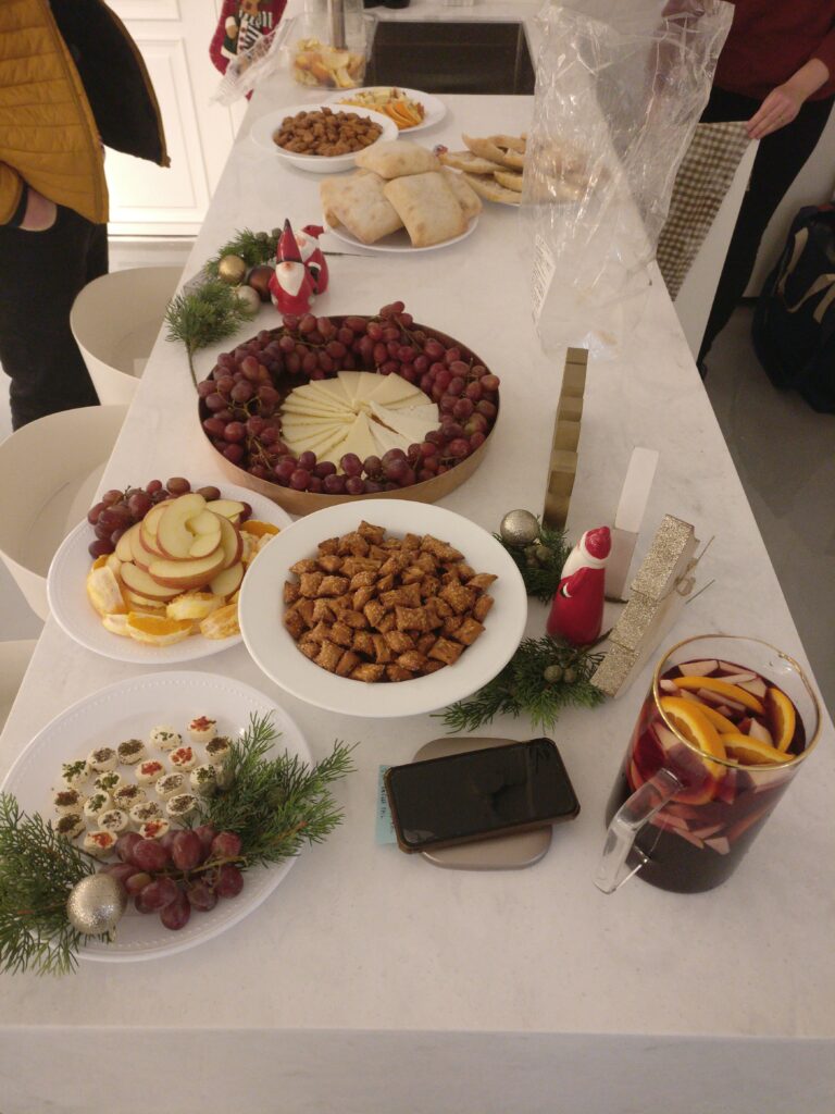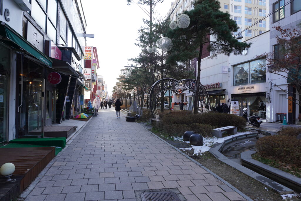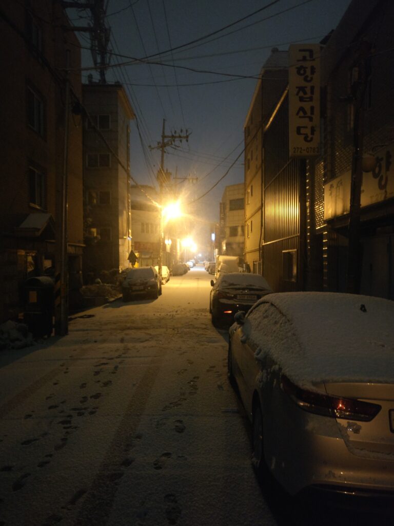 Am Samstag habe ich dann erstmal ausgeschlafen und bin dann ganz gemütlich zum Busterminal, um nach Cheongju zu fahren. Cheongju liegt ein bisschen nord östlich von Daejeon, einer der größeren Städte. Dort wurde nämlich zu einer Pre-Christmas Party eingeladen und ich wollte die Leute, die ich in Busan kennen gelernt habe noch einmal dort besuchen. Also in die U-Bahn zum Busterminal und dort mein Ticket für die Fahrt besorgt. Da ich eigentlich viel zu früh dran war und die Busse sehr regelmäßig fahren, musste ich nicht lange warten und konnte gleich den nächsten Bus nehmen. Der Bus war eine sehr angenehme Überraschung, da quasi Massagestühle verbaut waren (also keine richtigen, aber von der Größe her). Nach einer halbwegs entspannten Fahrt von 1,5h war ich dann in Cheongju und wurde dort von einer Bekannten abgeholt. Gemeinsam ging es dann zur Wohnung einer Freundin, die das alles organisiert hatte. Dort angekommen wurde auch gleich mit angepackt und alles bereit gemacht für ein schönes Weihnachtsessen. Wir hatten über die Freundin Zugang zu einem ‚Studio‘ bekommen. Das ganze war nicht weit weg und allzu viel hatten wir auch nicht dabei, sodass das schnell erledigt war. Das Studio war wirklich hübsch eingerichtet und einer der anderen Gäste hatte noch Weihnachtsdeko dabei. So wurde dann alles her gerichtet. Später kamen dann noch ein paar weitere Freunde der Bekannten und dann konnte die Weihnachtsfeier losgehen. Es wurde sehr lecker gegessen und die Zeit genossen. Da das Studio aber nicht allzu warm war, sind wir nach dem Abendessen wieder in die Wohnung der Freundin und haben uns es dort gemütlich gemacht. Es gab neben Glühwein auch noch heiße Schokolade zum trinken. Zwischendrin wurde dann noch Karten gespielt. Irgendwann in der Nacht ging es dann aber für alle wieder nach Hause. So haben wir noch einen Nachtspaziergang gemacht und konnten unseren Augen nicht trauen, als wir raus gekommen sind, weil Schnee lag. Es war wie im Winter Wonderland, eine kleine Schicht Schnee, aber unberührt. Nach einer schönen Runde ging es nach ‚Hause‘.